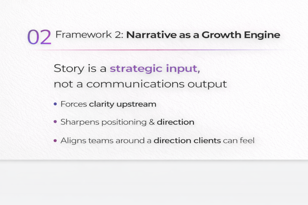 When narrative is treated as expression, it decorates decisions that have already been made. When it’s treated as a growth engine, it shapes those decisions upstream.